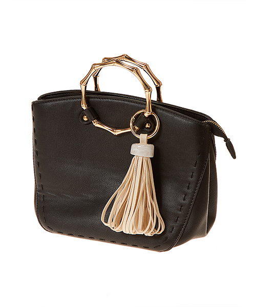 キャッチーなリングハンドルでオシャレ度急上昇 バンブー風のリングハンドルが、キラリとリッチに煌めくバッグ。フロントのステッチやタッセルチャームなど、一層オシャレに魅せるディテールに注目です。マチがしっかりあり収納力も抜群なので、オンオフ問わず活躍します。