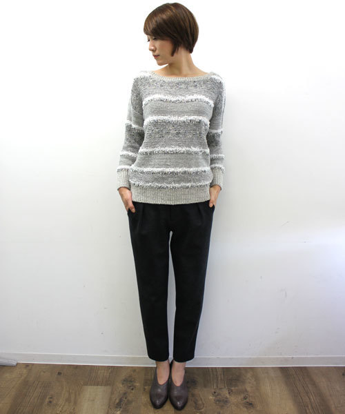 ガランテらしいファンシーな編地が目を引くミックスカラーのボーダーニット。5つの素材の糸を1本1本計算して仕上げたニットはスペシャル感たっぷり。ストンとした落ち感のあるリラックス感のあるシルエットながらもすっきりと開いたデコルテラインや肩を落とした丸みのあるフォルムなど女性らしい雰囲気漂う1枚です。