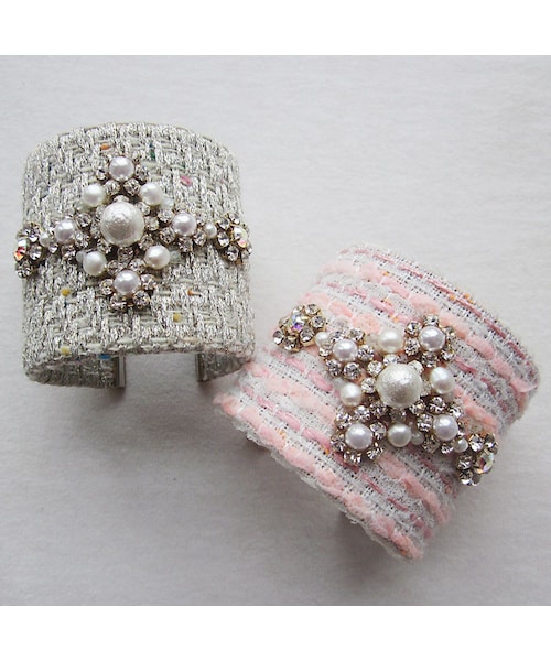 イタリア製のファンシーツイードを使用し ビジューを施したバングル。 綺麗な生地の上にキラキラなビジューが光り、 腕元が輝きます。 柔らかいバングル芯を使用しており、 使用して、手首の形に沿うように触っている内に、 自分の腕の形に フィットしていきます。 最近特に、7分袖のトップスが多くなってきて 腕元のアクセサリーは、欲しいところ キラキラ光って目立つので、 褒められる事も多いのでは* 大き目の目立つバングルがガツンとあれば コーディネートにもパンチが効いてきます。 大きさ 縦6.2cmx幅約6.5cm <使用素材> イタリア製ツイード・ガラスラインストーン チェコビーズ・チェコガラス・コットンパール・樹脂パール 淡水パール