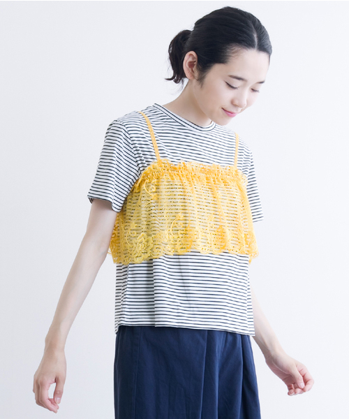 大人気のレースキャミソールにトップスがセットになって登場 キャミソールは後身頃はゴムになった嬉しいアイテム。 春夏人気のマスタードカラーも取り入れるだけで華やかな雰囲気に♪