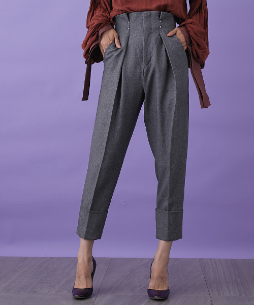 ■STUDIOUS HIGH■ヴィンテージスタイルに現代の感覚をMIXさせた新しいスタイルを再構築。クラシカルな素材・ディテールを、より自由な解釈で今着たいスタイルへと進化させております。古いものと新しいもの、綺麗なものと粗野なもの、相反する要素を1つのプロダクトに落とし込んだ、手にした方の感性で、新たに作り出されるヴィンテージスタイル。マニッシュでウールの様な雰囲気をポリエステルで表現した素材を使用。しっかりした厚みはありつつ軽さもあり、ウールのようにチクチクしないのが嬉しいポイント。深い色合いで高級感があります。ウエスト周りはすっきりしているので、トップスをインして着るのはもちろん、オーバーで着ても邪魔になりません。フロントのタックで立体的に身体を包むようなシルエット。裾に大きくとったダブルカフスがデザインのアクセント。サイドの脇線や後ろポケットのディテールにもこだわった、シンプルながら印象的なパンツです。