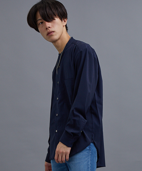 『着心地抜群、品のある着こなしを可能にする1着』 シンプルながら上品な雰囲気を演出してくれるシャツ。 【Fabric】 キュプラとポリエステルの染め分けによりメランジ風のウール調に仕上げたポリエステル素材を使用。 ふくらみ感のある風合いに柔らかな質感が特徴。 肌触りも非常に滑らかで、ストレッチも効いておりますので非常に快適な着心地を実現。 【Design】 ややゆったりとしたストレスの無いシルエット。 トレンドのバンドカラーで首元をすっきりとさせることでスタイリングのリラックス感を演出。 ポケットは埋め込まれたような片玉縁ポケットを採用し、フラットな仕上げによりミニマルで都会的な印象に。 1枚でもインナー使いでもさらっと使える嬉しい1着。
