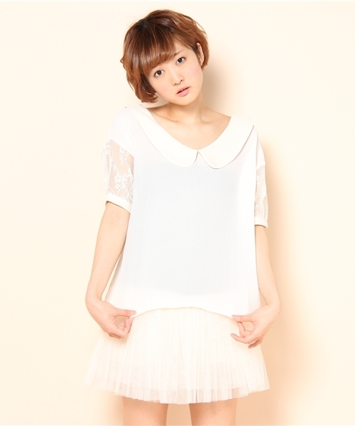 袖がレースになっているのがポイントです。 丸襟もレトロな可愛い雰囲気で着て頂けます。 model:H163 B86 W60 H87 着用サイズ:フリ-