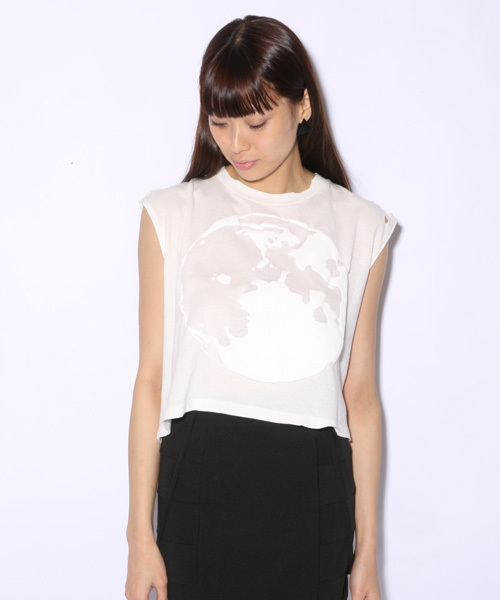 前後の月と地球プリントがインパクト大のTシャツです。 立体感のあるプリントがとても可愛いです☆袖のクラッシュがぬけ感のあるスタイルを演出します。 model:H169 B79 W58 H83 着用サイズ:FREE