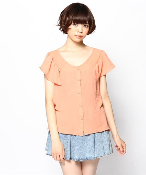 肩のフリルが大きめでポイントになります☆鮮やかな夏らしいカラーも揃っているので、これからのシーズンお勧めです。ボタンを前にして羽織として、ボタンを後ろにしてプルオーバーとして、前後2WAYで着て頂けます。