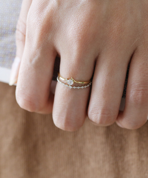 細かな粒を連続して掘りいれる“ミル打ち”という装飾を施した、繊細なデザインのリング。 中央には一粒のビジューがさりげなく輝き、シンプルながらも飽きの来ないデザインとなっています。 お手持ちのリングと重ね使いをしてもオシャレにまとまります♪ ※ATTENTION※ ■製造・輸送時についた微細なキズが見られる場合がございます。 上記は不良の対象外となりますので、予めご了承くださいませ。