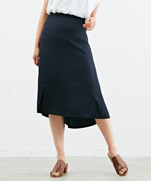微光沢のある上品なツイルのアシンメトリーデザインのスカート。裾にスリットを入れて、歩くたびにふわりと動きの出るディティールに。シンプルながら女性らしさを演出してくれる1枚。