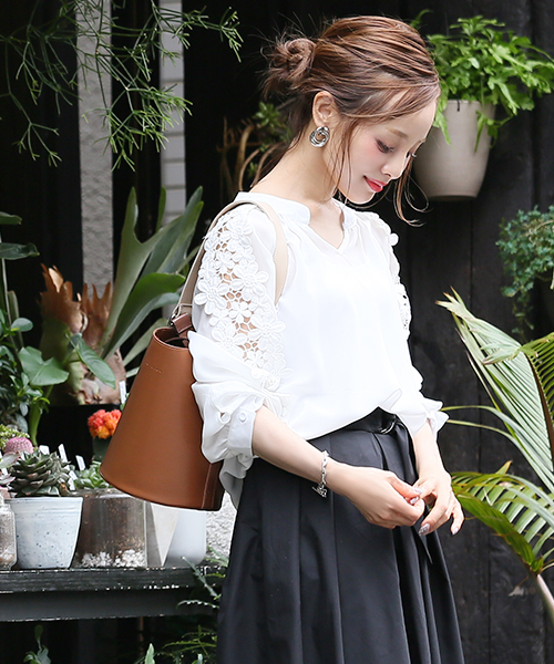 フラワーレースをあしらったバルーンスリーブが上品なシフォンブラウス♪キーネック風の首元でデコルテを綺麗に見せてくれます!大人な透け感が楽しめるフェミニンをたっぷり詰め込んだ1枚です♪ 生地感:薄手シフォン生地 伸縮性:なし 透け感:あり(インナー必須) 注意点:レース部分引っ掛け注意 お洗濯方法によっては縮みや色あせの可能性あり。乾燥機等のご使用はお控え下さい。 ▼モデル着用写真は撮影環境により、多少実際のカラーと異なる場合がございます。タンブラー乾燥はお避け下さい。