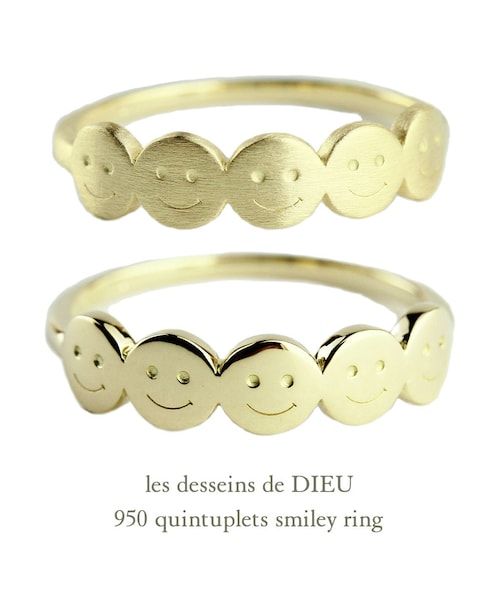 「 Quintuplets Smile 」 5つのにこちゃんがポップな印象の スマイル リング 愛嬌のある表情に癒されるとともに、手元を眺めるたびに笑顔になりそうです。 華奢なスマイル にこちゃんのリングは身に着ける人を笑顔美人にしてくれます。 マット、シャイニーからお選び頂けます。 ご自身へのご褒美に、そしてプレゼントにもお薦めのリングです。 18金イエローゴールド製