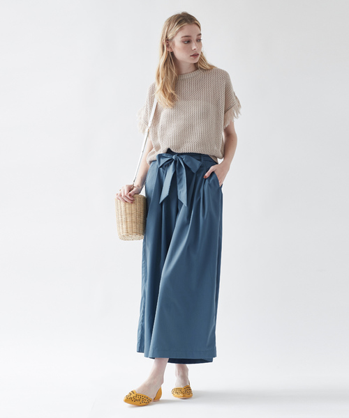 Aラインに広がるシルエットが綺麗なワイドフレアパンツ。フロントにしっかりボリュームのあるタックデザインを施しました。スカートのようにも見えるフレアパンツは、普段パンツを履かない方も取り入れやすく、さらにベルトでウエストマークできるのでコーディネートしやすいのも嬉しいポイントです。