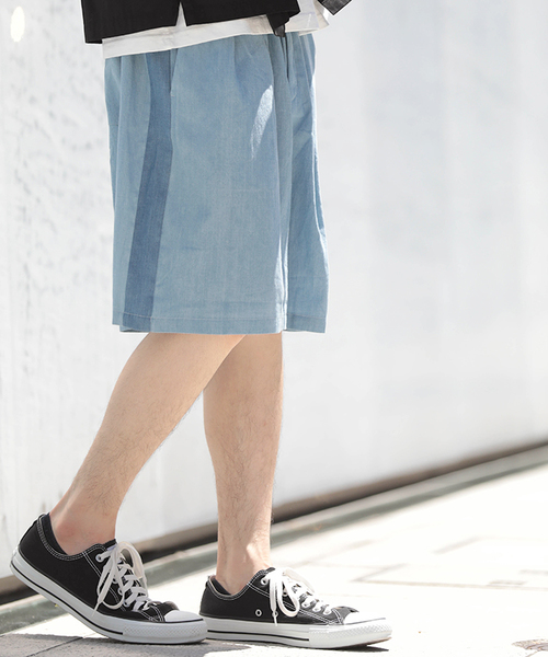 軽やかなデニム素材で仕上げたボリュームショーツ。サイドにあしらわれたラインデザインが、手軽に着こなしのアクセントになります。股上をやや深くとることでリラックスして快適に着用頂けるひと品。膝丈の穿きやすさはそのままに、シルエットで遊び心をプラスしたこだわりのデザイン。また、ウエストは調節ひもとゴム仕様で簡単に着脱可能なのも嬉しいポイント。人気のロング丈トップスやスニーカーと合わせるような着こなしも今季オススメです。