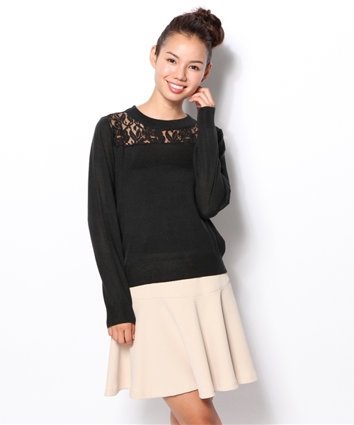 who’s who Chico(フーズフーチコ) レースの切替部分が印象的なニットは、今シーズンオススメのアイテム♪人気のウエストにインしたコーディネートでいつもと違ったスタイリングも◎