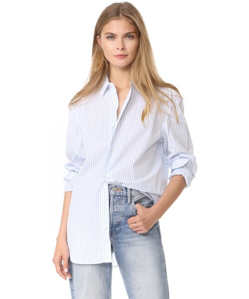 A menswear-inspired FRAME button-down shirt with tidy stripes. Long sleeves and button cuffs. Fold-over collar and button placket. Fabric: Shirting. 100% cotton. Wash warm or dry clean. Imported, India. Measurements Length: 28.75in / 73cm, from shoulder Measurements from size S