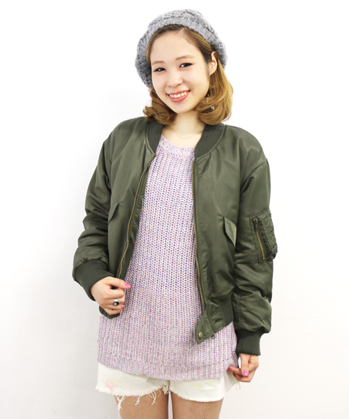 ちょっぴりルーズシルエットのMA-1はガーリーなワンピやスカートスタイルのはずしにも◎ model:身長157cm 着用サイズ:F ※画像の商品はサンプルです。