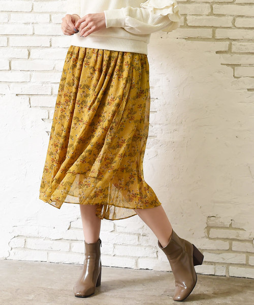 ひざ下のロング丈に、動く度に揺れる アシンメトリーな裾が女性らしいスカート。 巻きスカートのようなデザインがトレンドライクな仕上がり♪ 楊柳のシフォン素材を使用し、ニュアンス感をプラスしてくれます。 程よくインパクトのあるヴィンテージ風の小花柄で、 シンプルになりがちな夏のコーディネートのアクセントにぴったり◎ ウエストはゴム仕様なので、リラックスした着心地で、 アクティブになる夏のレジャーシーンにも 大活躍間違いなしのアイテムです! ◆素材 サラッとした清涼感のある楊柳シフォン素材。 伸縮性なし/透け感あり/裏地あり ◆ケア方法 ・30℃以下でのお洗濯をおすすめ致します。 ・アイロンをかける場合は低温でご使用下さい。 ◆注意事項 *撮影場所やイメージにより 実際の商品と色味が若干異なる場合がございます。 商品のお色味はカラーバリエーション画像をご参照ください。