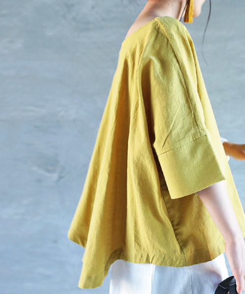 ユーモアたっぷり、なびく空気感 ドルマントップスの登場です!新しい定番になる予感のトップスが出来上がりました。 ユーモアたっぷり、横にたっぷりボリュームを持たせたドルマンの形。袖もゆったり旬の雰囲気。 緩さ=こなれ感にしてくれる、シンプルなのに技アリな一着です。綿100%で心地良く着られるので、ついつい手に取りたくなります。 袖はカフス切り替え、裾は裏バインダー始末で、上品な印象にしてくれます。ネックラインは見返し襟となっており、表面に縫い目を作らないことでより女性らしいラインのデコルテに仕上げてくれます。 まさに、美人襟と呼ばれるのも納得のハイブランドでも採用される形となっています。リラックスして楽々着られるので私達のお洒落を後押ししてくれる強い味方になりそう。