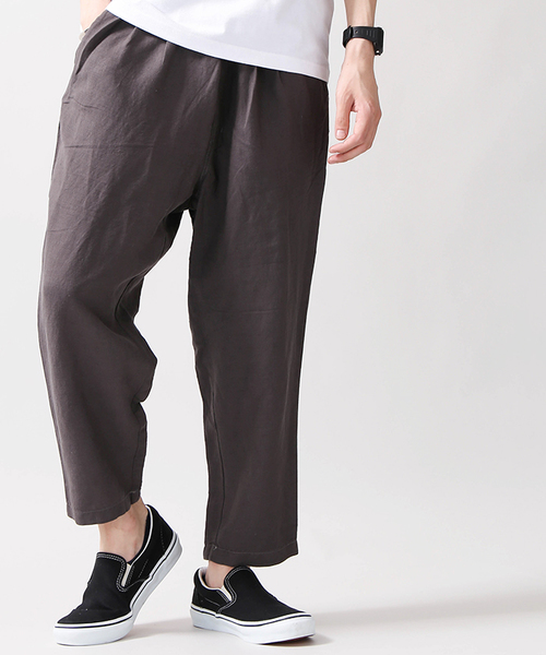 生地にリネンとレーヨン素材を混ぜ込んだアンクルパンツ。リネンの清涼感と速乾性、レーヨンの滑らかさと落ち感を兼ね備えた一本です。非常に通気性が良く、梅雨の時期や真夏にも快適にご着用頂けます。程よくボリューム感を持たせながらも、緩めのスリムテーパード仕様で足元はスッキリとアンクル丈で仕上げています。ラフになり過ぎず、こなれた雰囲気を着こなしに演出してくれるひと品。定番のカラーに加えて、着こなしのアクセントになるストライプ柄もご用意しました。今季はアクセサリーやスニーカーなど、小物で遊びを効かせたコーディネートもオススメです。