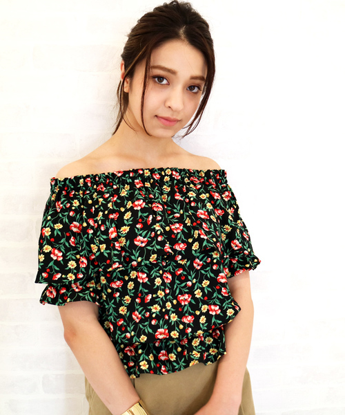 秋冬カラーの花柄プリントで長く愛用できるオフショルブラウス!トレンドのフリルデザインを、袖口と裾に施しているので、キュッと引き締まるバランスが絶妙。コンパクトなシルエットなので、デニムやチノなど、カジュアルボトムと合わせやすいです。