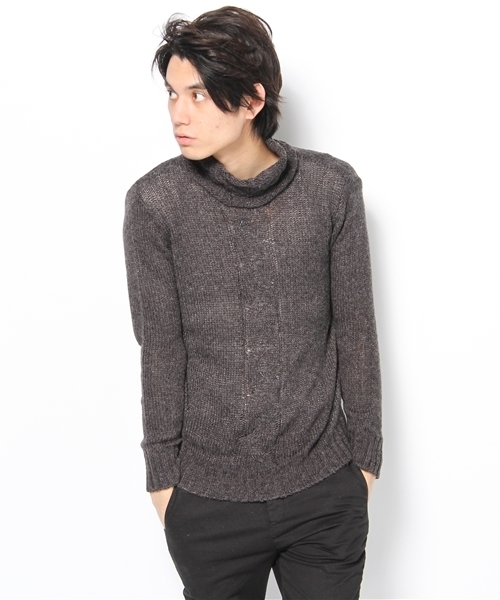 Lui's新作のケーブルハイネックニットの入荷です。今期トレンドのハイネックのディテールをベースに、フロント&ネック部分にケーブル編みのデザインを大胆に盛り込んだニットになります。インナーでお使いいただいてもかなりポイントになるニットです。