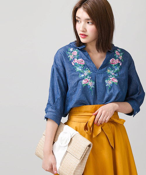 フロント部分に刺繍を施したスキッパーシャツ。鮮やかなフラワー柄の刺繍が、スタイリングに華やかさを持たせてくれます。 程よくゆったりしたシルエットと、広く開いた胸元がデコルテ部分を綺麗に見せてくれるのも特徴。普段の着こなしにフェミニンな雰囲気をプラスしてくれるひと品。 今季はアクセサリーやスニーカーなど、小物で遊びを効かせたコーディネートもオススメです。