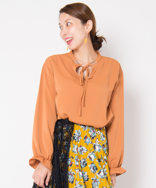 ネックラインで煌くビジューが、顔周りをグンと華やかに演出するClay blouse(クレイブラウス)。袖口にギャザーを効かせたスリーブや、スタンドカラーの襟元に施したリボンで、フェミニンさもプラス。サラリとした、マテリアルは着心地も抜群です。女性らしい柔らかな雰囲気は、フレアスカートなどに合わせて品よくまとめても、ワイドパンツでクラシカルにまとめても◎。