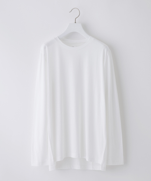 『抜群の肌触りが病み付きの1着』さらりとした肌触りで着心地抜群のカットソー。【Fabric】 レーヨンとコットンの混紡素材を使用し、滑らかな肌触りにテロッとした落ち感が魅力。シルクのような上質な触り心地と程よい光沢感が魅力。サラッとした着心地が病み付きの素材感です。【Design】 非常にシンプルでミニマルなデザインは何にでも合わせることが出来る汎用性の高いアイテム。やや後ろ裾を長くすることでインナー使いでの表情に変化を付けています。薄手のインナーのため、オールシーズン使えるのも嬉しいポイントです。