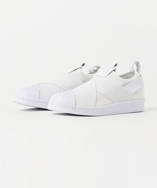 【adidas(アディダス)】 ドイツ、バイエルン州に本社を置く、スポーツ用品メーカー。 1920年にドイツ・ニュルンベルク近郊のヘルツォーゲンアウラッハで、靴職人の息子のルドルフ・ダスラー(兄)・アドルフ・ダスラーの兄弟が、靴の製造会社として「ダスラー兄弟商会」を設立したのが始まり。 1948年にルドルフとアドルフの意見対立により「ダスラー兄弟商会」を解消、アドルフはアディダス社を設立した。 「アディダス」の由来は、アドルフの愛称「アディ」とファミリーネームの「ダスラー」をつなげたもの。 誰もが愛してやまないSUPERSTARシューズをシックなスリッポンにした「SUPERSTAR Slipon」。 ストレッチ性のあるエラスチンのアッパーに幅広のエラスチックなストラップを前足部分を包むようにあしらってぴったりとしつつも柔軟なフィット感を実現。