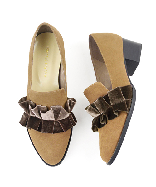 フロントのフリルが目を引くパンプスは、バイカラーが見ているだけでも可愛い1足。秋冬ならではのベロア素材でほっこりする足元を演出してくれる。深めの履き口でレッグアイテムとも相性抜群。落ち着いた色味の多い秋冬に1足は持っておきたいアイテム。 【オススメPOINT】 ◇トレンドのフリル付きパンプスで主役級の足元に ◇程良いラウンドトゥで足先も痛くなりにくい