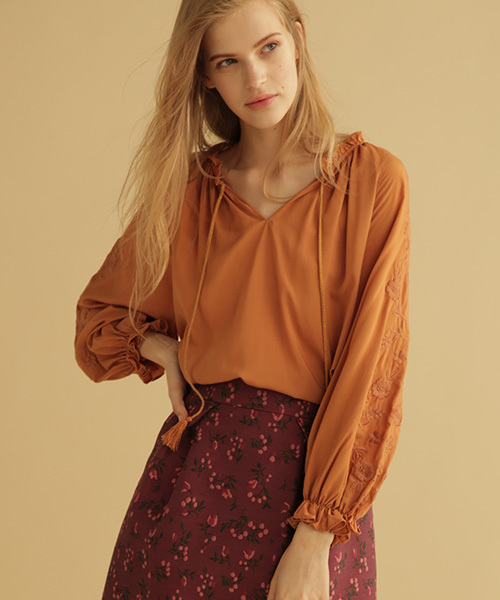 【ワントーンの中にこだわりを詰め込んだブラウス】 ■DESIGN POINT■ ゆったりとしたシルエット、ボリューミーなパフスリーブに、女性らしく柔らかな雰囲気が漂うプルオーバーブラウス。 同色で馴染ませたフラワー刺繍がポイント。 フリルやフリンジディテールも効かせ、単色の中に奥行のある表情を生んでいます。 ■FABRIC POINT■ 肌触りが良く、落ち感が大人らしいレーヨン素材を使用。 ■STYLING POINT■ タッセル付きの紐はルーズに垂らして、襟元の抜け感を演出して。 スカートインスタイルはもちろん、シンプルなパンツに合わせてラフに着こなすのも◎。
