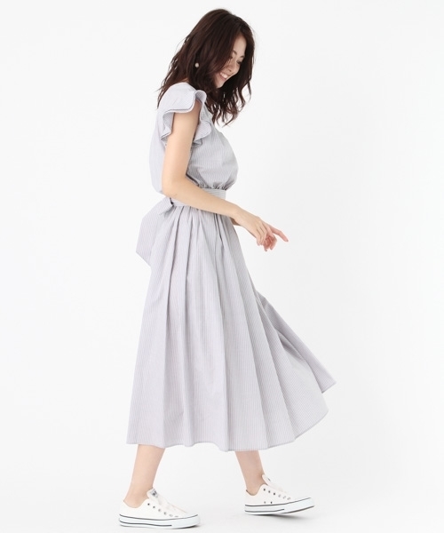 背中のクロスモチーフと袖フリルがポイントのロングワンピースです。秋らしいカラーで今から先取りできます。涼しげな素材なので、暑い夏にも最適な1枚。スニーカーでカジュアルに外しても、サンダルでフェミニンに着こなしても◎