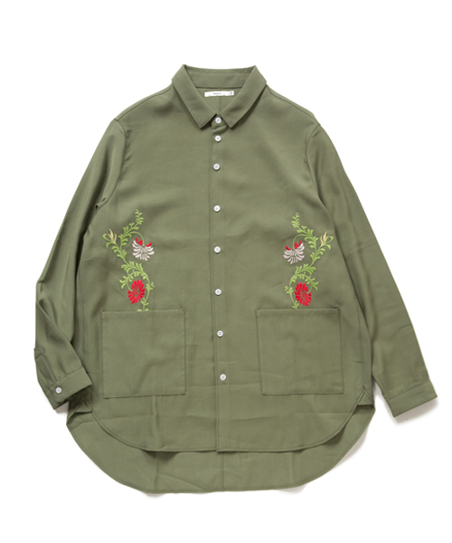 ゆったりとしたシルエットに大胆に配された花の刺繍が特徴的なシャツです。【 生地 】きめ細やかな織り地のさらりとした風合いをもつオックス生地を使用しています。【 シルエット 】身幅を広めにゆったりとしたシルエットで羽織り物としても重宝するサイズ感になっています。【 仕様 】フロントポケットから古着のようにあまめに打ち込んだ刺繍を大胆に配しています。衿を小さめにし首元を上品にすっきり見せれるようにしています。