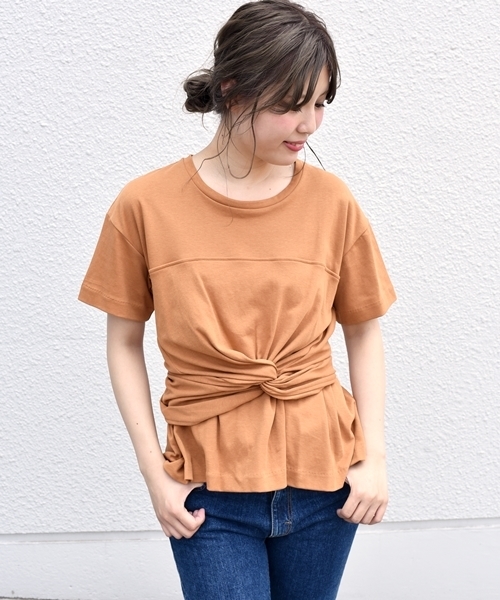 フロントのねじりデザインとバックのギャザーが印象的なトップス。伸縮性があり着心地◎。一枚で着てもサマになるアイテムです。 ※末永く愛用頂く為に、アテンションタグ・洗濯ネームを必ずご確認の上、着用又はお取り扱い下さい。