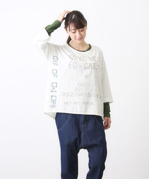 綿×麻の素材感でもハードウォッシュ加工をかけることで麻の涼しい素材感でもふんわりと柔らかな着心地に仕上がっています。 一枚でサラリと着るのはもちろん中にボーダーのインナーと合わせて袖からインナーをチラ見せするのもGood! カットソー全体にプリントされているロゴもナチュラルのカラーだとさりげない感じになりますね。 麻の風合いが最大限に出される色合いですね♪