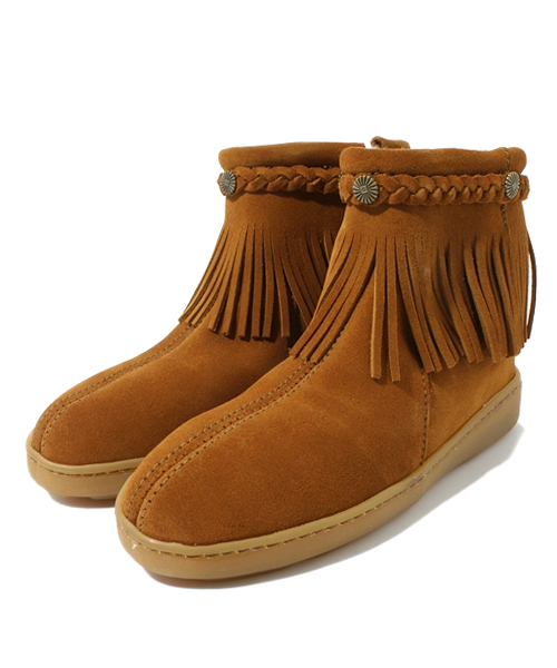 ミネトンカのフリンジショートブーツです。履き口にコンチョが付いています。サイドジップなので着脱もラクラクです。ソフトで上質なスエードレザー。柔らかいフリースパイルは暖かく快適で、滑りにくく軽いラバーソール使用です。