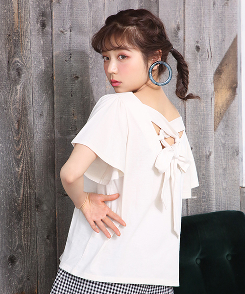 ~NICECLAUP 2017 Autumn Collection~背中のレースアップデザインがポイントのTシャツ。シンプルTはどんなボトムとも相性抜群☆柔らかく肌触りの良い素材感で、今から大活躍間違いなし!レースアップのデザインがポイント。大きめのリボンがガーリーな印象に♪○コーディネート○フェミニンに着るならタイトスカートや台形ミニで肌見せ。カジュアル派はワイドパンツにON!!