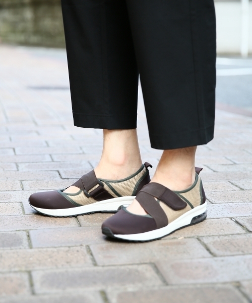 ☆スポーティな中にモードを感じるデザイン☆スポーツタイプのスニーカーにモードな要素をプラスし、デザインにひねりを加えた一足。斜めに通ったゴムベルトがデザインのアクセントでもあり脱ぎ履きしやすい機能性にも一役買っています。甲の部分が広めにあいていて抜け感があるので夏でも軽やかで涼しげな印象です。クッション性のあるソールを使用しており履き心地と歩きやすさも抜群で実用性も抜群です。シックなデザインはきれい目なスタイルにも馴染むので、コーディネートの幅が広がります。
