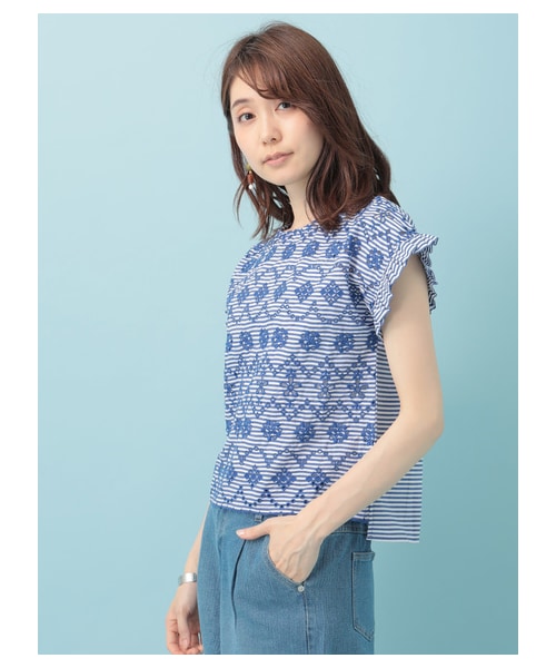 爽やかなボーダー柄のベースに、立体的なお花刺繍を添えて華やかな印象に仕上た半袖ブラウスです。 さらっとした心地よい肌触りの生地を使用し、シーズン通して長く愛用できるのも魅力的なポイント!定番ボトムスとのコーディネートもサマになる1枚は、ワードローブの即戦力として幅広い活躍が期待できそう◎