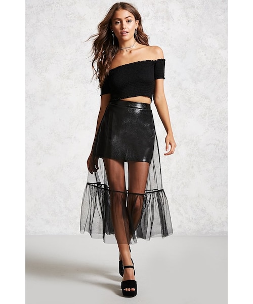 Details A flowy semi-sheer mesh maxi skirt featuring a ruffled hem panel, an interior textured faux leather mini skirt with an A-line silhouette, and a concealed back zip closure. Content + Care - Shell, Backing & Lining: 100% polyester - Hand wash cold - Made in China