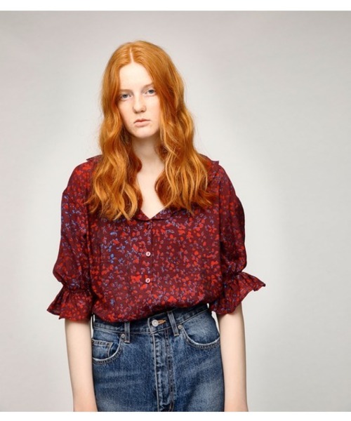 【DYE FLOWER BLOUSE】 秋を意識したダークトーンのFLOWER柄はMOUSSYオリジナルのもの。ラッフルデザインか鎖骨周りや手首を華奢に見せてくれます。MOUSSYらしくデニムとスタイリングして。