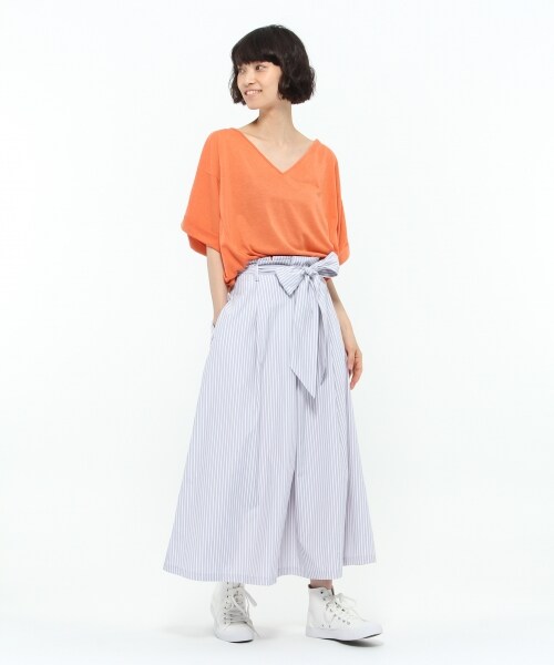 コットン・ポリエステルのややハリのある生地を使用したロングスカート。夏にぴったりの爽やかなカラーリングのストライプに仕上げました。大きめのリボンベルトがポイントで、トップスをINしてウエストマークするのがオススメ。トレンドのペーパーバックウエストと、複雑にとられたタッキングでおなか周りをすっきりと見せてくれます。ブラウスを合わせてガーリーなスタイルはもちろん、あえてカジュアルなTシャツと合わせてボーイッシュなスタイリングにも。