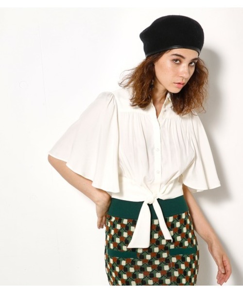 ハリ感のある素材を使用したフレアスリーブが可愛いシャツ。クロップド丈で、フロントのリボンを結んで着るのがおすすめです。