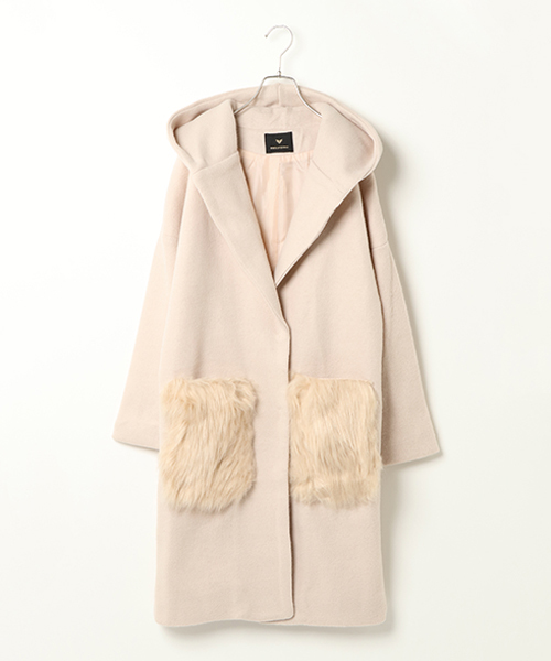 ボリュームがあるのに軽く、ふんわりとした肌触りのフーテッドコート。ふわふわリッチなボリュームが今っぽいフェイクファーのポケット付きで、手がすっぽり入るサイズ感がとびきりカワイイ!! 大きめシルエットはインに厚手のニットなどを着ても窮屈感なく着て頂けますよ♪ ボタンを開けるとローブコートのようなワイドカラーになってオシャレです。 ※着用画像はサンプル商品になりますので仕様変更の可能性がございます。