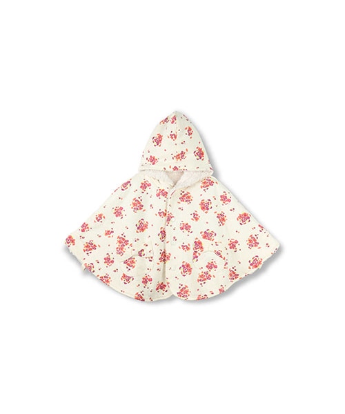 やわらかな天竺素材にブーケのお花がプリントされたベビーケープです。よく見ると小さな針抜きデザインが花の型になっておりギフト栄え間違え無し。ポケットがリボンデザインになっているところも可愛いポイント。リバーシブル仕様で、後ろのベルト位置を変えるだけで、授乳ケープに早変わりです。