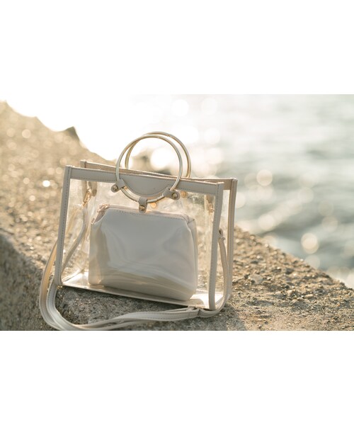 "今季注目のシースルーバッグ。 スクエア型のクリアバッグに、リングハンドルを合わせて大人っぽい印象に仕上げています。 中にポーチがついてくるのもうれしいポイントです。"