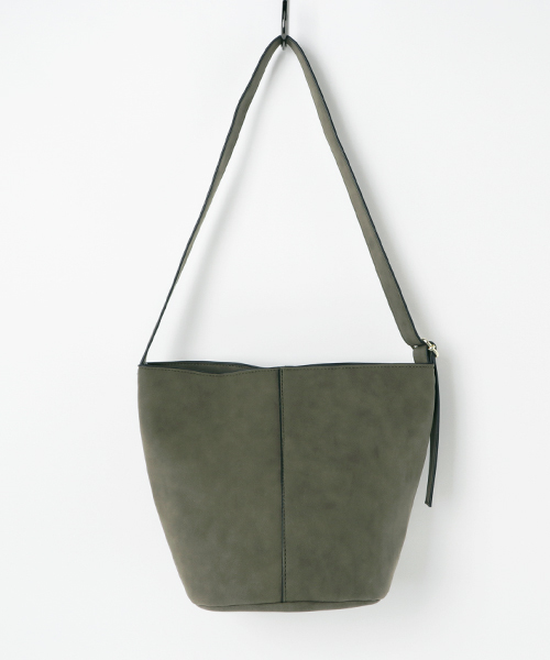 ピーチスキンのようなマットな質感のフェイクレザーショルダー。トレンドでもある丸底のバケツ型は、見た目以上の収納力で荷物の多い方でも安心です。深みのある色味がきれいで、配色のパイピングも全体が引き締まった印象。A4収納サイズでお仕事にも持って行けます。
