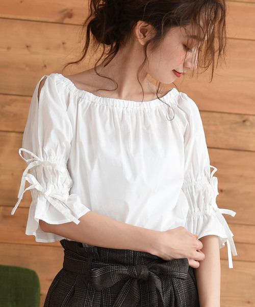 ハリのある綿100%素材を使用した、 シャーリングオフショルブラウス。 スリットの入った袖にワンポイントの りぼんが付いた袖コンシャスなデザイントップス。 露出を控えたい方は、肩を出さずに ボートネックとして着るのもおすすめ。 スタイリングに合わせて2wayで着まわせる優秀アイテム。 秋まで着れる7分袖で、これからの季節に大活躍の1枚です。 ◆素材 ハリのあるコットン100%素材。 伸縮性なし/オフホワイトのみ透け感あり/裏地あり ◆ケア方法 ・お洗濯の際は手洗い、またはネットの使用をおすすめ致します。 ・アイロンをかける場合は低温でご使用下さい。 ◆注意事項 *撮影場所やイメージにより 実際の商品と色味が若干異なる場合がございます。 商品のお色味はカラーバリエーション画像をご参照ください。