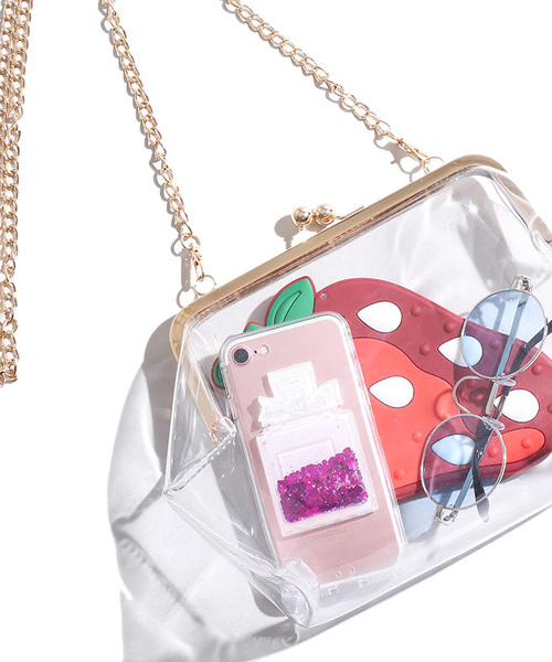 がま口デザインで仕上げたショルダーバッグ。小ぶりなシルエットが、持っているだけでスタイルを可愛く見せてくれます。 透け感のあるクリア素材ですので、あえて中に入れたアイテムを見せるような使い方もオススメ。普段のスタイリングに取り入れるだけで、手軽に着こなしのアクセントになります。 お値段も手頃ですので、ご自身用は勿論、プレゼントにもオススメです。