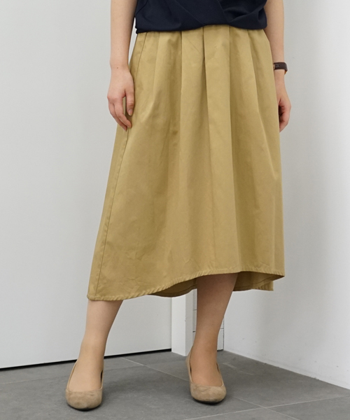 タックワークとイレギュラーへムが作り出すニュアンスのあるフレアシルエットで、上品エレガントに仕上げたミディスカート。 ウエストはバックのみゴムギャザーに切り替えているのでフィット感も良く、フロントはフラットに仕上げてきちんと感もプラス◎ シンプルなワンカラーのルックスでコーディネートに品よく馴染み、オンオフ幅広いスタイリングに活躍してくれるアイテムです!