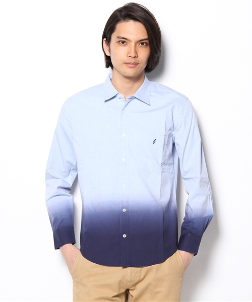 【モード感のあるデザインが特徴のシャツ】 グラデーションデザインがアクセントになったシャツ。一枚でシンプルな着こなしも、レイヤードでもスタイリングの主役になるアイテムです。キャップとのストリートミックスのコーディネートもおすすめです。 ※WEB限定価格となっております。 店頭価格と異なる場合がございますので予めご了承ください。 サックスブルー model:H182 B90 W71 H93 着用サイズ:LARGE