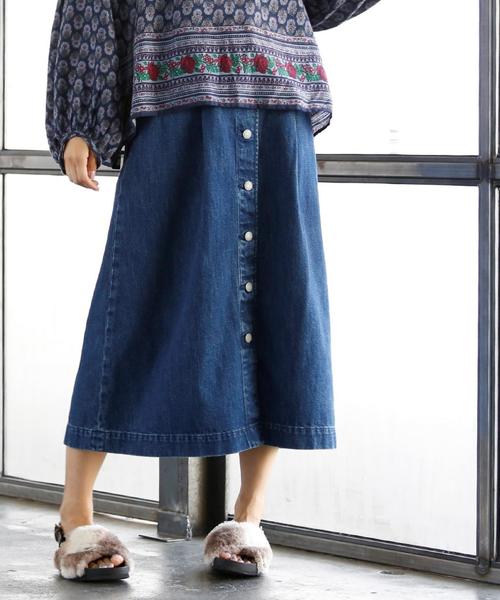 ほんのりと広がるフレアシルエットが大人ガーリーなデニムスカートレトロなムードのフロントボタンがアクセントになったフレアスカート。USAコットン(上質なアメリカ綿)で仕上げた拘りの1枚です。安心感のあるミモレ丈が大人っぽい印象。楽々のバックゴムウエストもポイントです。【コーディネート】ポインテッドトゥなどのレディなシューズは勿論、トレンドのファーサンダルやスリッパサンダルなどとも好相性のミディ丈です。ヴィンテージライクな刺繍ブラウスや、袖ボリュームのデザインニットなどと合わせても可愛いです。※取り扱いの際は、取り扱い表示をご確認の上、次の点に十分ご注意ください。・特性上、色落ちしやすい素材です。・洗濯や着用の繰り返しで徐々に色落ちし、白っぽくなります。・着用中のバッグやベルトなどとのスレによる色落ち、色移りにご注意ください。・淡色との組み合わせで色移りすることがありますので、下着などご注意ください。・直射日光の当たる場所に、長時間放置しないでください。※原料はアメリカのUSAコットンですが、紡績・縫製はアメリカとは異なります。※実店舗と発売時期が異なることがございます。あらかじめ御了承下さい。※商品サンプルにて撮影しております。※撮影場所やお使いのモニター環境により若干お色味が異なる場合がございます。店舗へお問い合わせの際は、全国のコーエン各店舗まで下記の品名/品番をお申し付け下さい。品名:MC USAコットンデニム SK 品番:7670-605-7056
